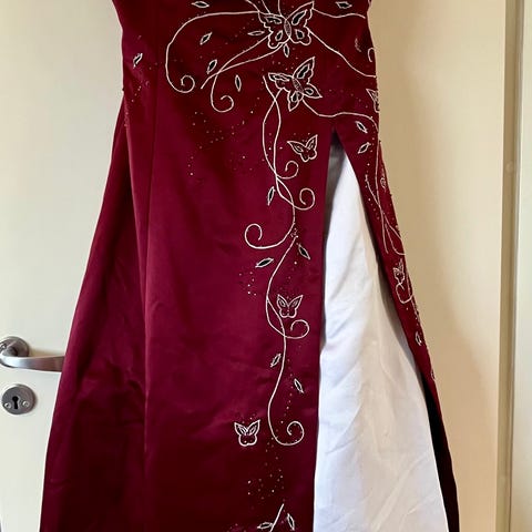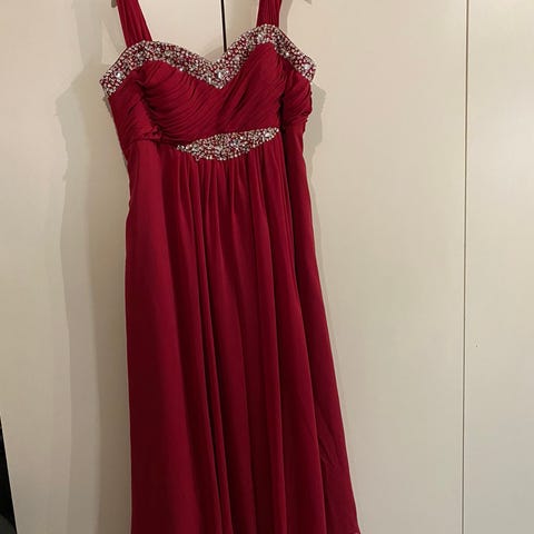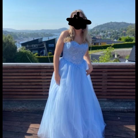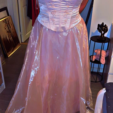 Vakker kjole til ball eller selskap i fargen light pink. Kjolen er ca str XL, men kan også brukes av de som bruker mindre størrelser. Ekstra lang, kan sys opp.