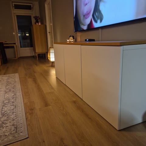 TV / media benk fra IKEA. Hvit glas. 3 hyller med fronter, og 2 skuffer.