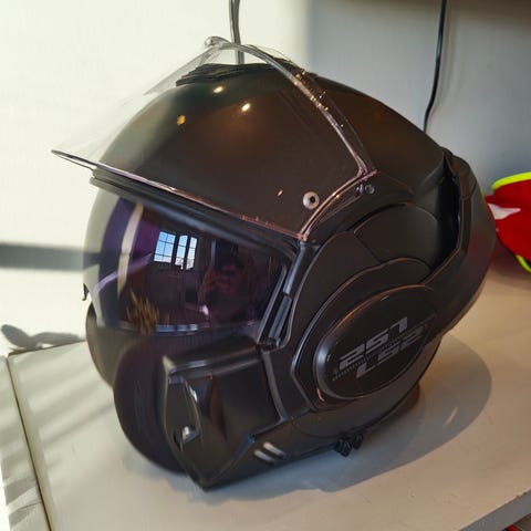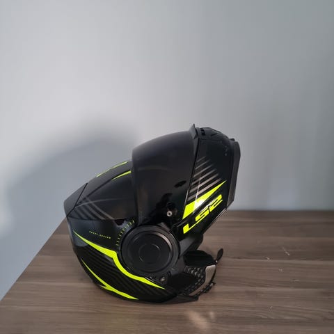 LS2 Storm motorsykkelhjelm med rødt og blått mønster. Hjelmen har integrert solvisir og hel frontvisir. Designet for å gi beskyttelse ved motorsykkelkjøring.