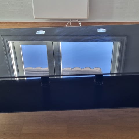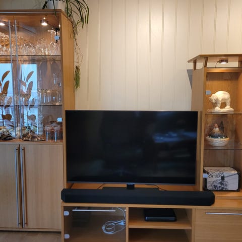 Tv seksjon med skap, skuffer og hyller. Lys i skap med glassdør
