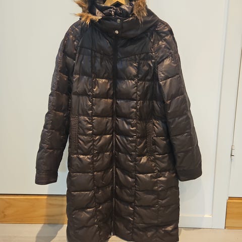 God og varm, brun dunkåpe med avtagbar hette som har avtagbar pelskant. Hette og pelskant tas av og på med glidelåser. Fasongen er lett utskrådd. Kåpen er nyvasket.