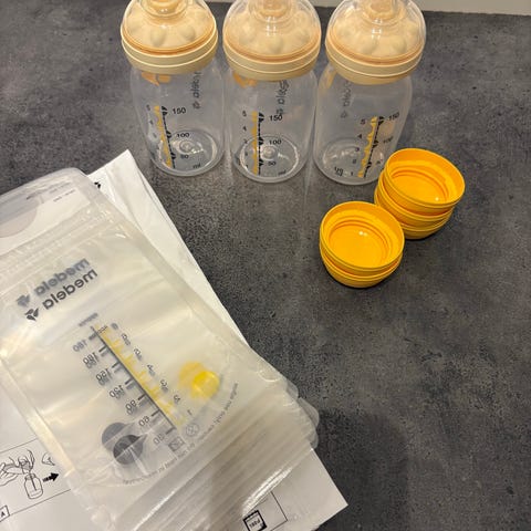 Medela flaskesett med 7 anti kolikk smokker og 9 flasker. 3 av flaskene har gule lokk. Passer til oppbevaring og mating av baby.