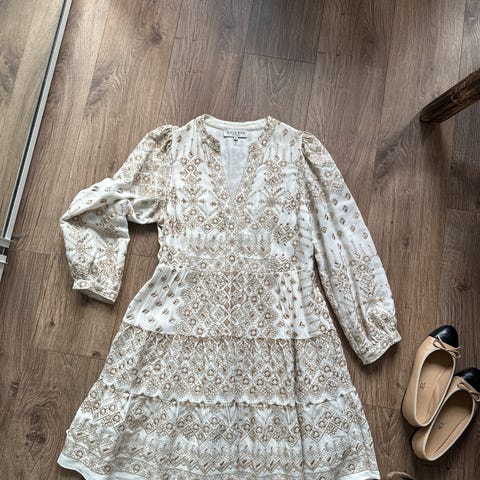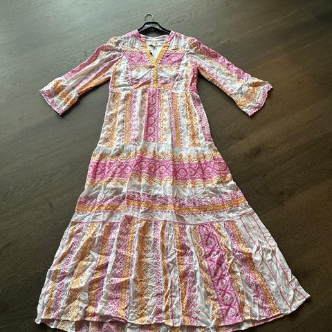Nydelig lang sommerkjole fra hale bob🌸🌺offwhite i bunn med vakre sommerfugler i rosa toner. Den er foret og har en splitt foran på kjolen som vist på bilde. Lange armer med strikk og snøring nederst så den kan man lett ta opp på armen.