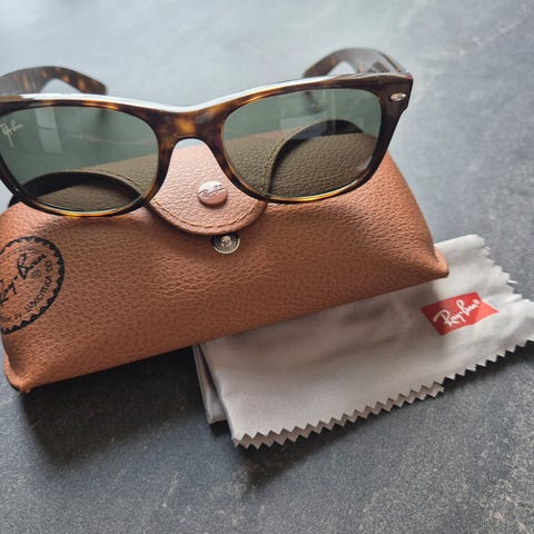 Selger meget pent brukte Ray-Ban New Wayfarer solbriller med polarized glass.