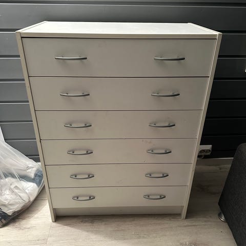 IKEA Alfred Homann kommode i hvit farge. Kommoden har flere skuffer i ulike størrelser for oppbevaring. Designet av Alfred Homann.