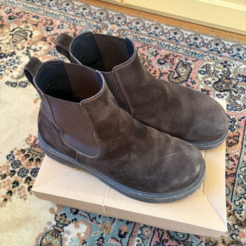 Birkenstock støvler i størrelse 41. Støvlene er grå og laget av skinnmateriale. Designet med elastiske sidepaneler for enkel på- og avkledning.