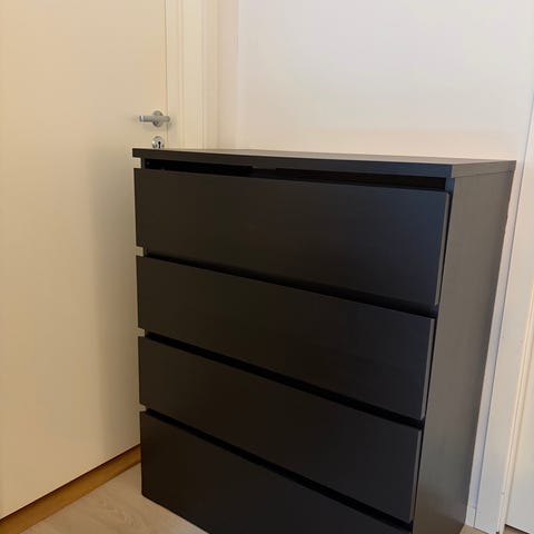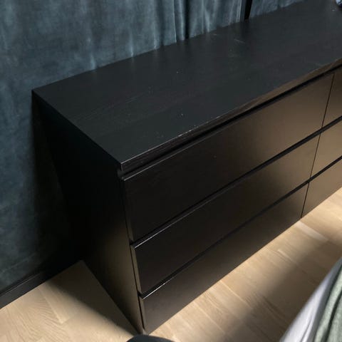 IKEA malm kommode i svart. Har noen få merker på skuffene (se bilde) og noen svake riper på toppen. Ellers i god stand. Kjøpt ny i 2022. Må hentes