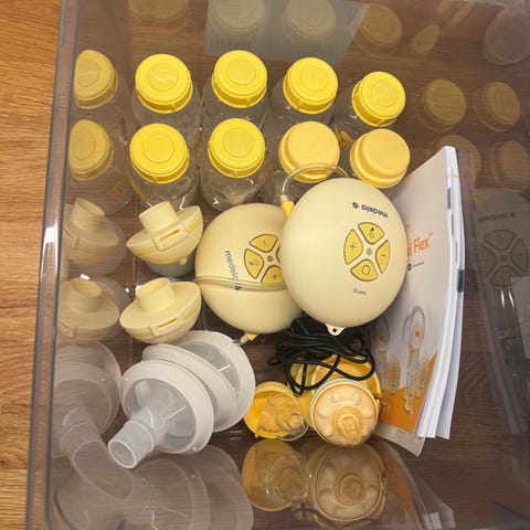 Det følger også med slangesett, lader (bare kabel), 4 stk melkeflasker. Obs, de gule holderne på bildet av pakken er borte, men flaskene står fint uten. Brysttraktene er i str 27 mm (av den nye typen med gummiring).