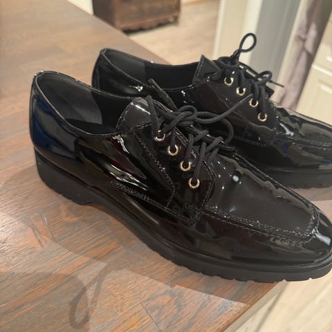 Högl pensko i størrelse 39 med svart lakkert materiale. Skoene har lisser og en profilert såle for bedre grep.