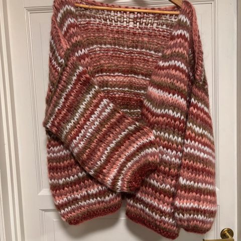 Britts cardigan strikket i Puno fra Rauma garn. Lengde ca. 64 cm, omkrets ca. 104 cm, lengde arm ca. 57. Kan sendes dersom kjøper betaler porto etter Posten takster.