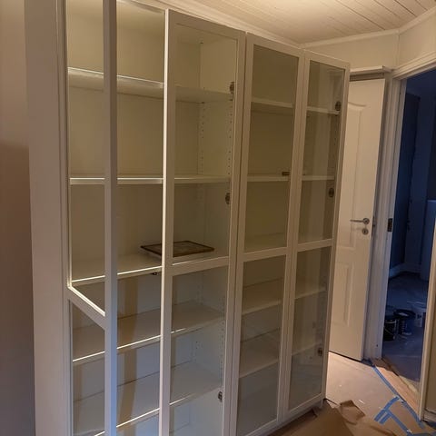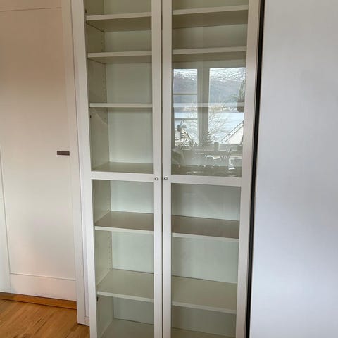 5 hyller og en netting kurv inkludert, der 4 hyller er i hvitbeiset eik og den siste i samme farge som stammen.