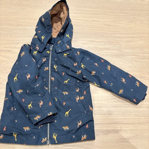 Blå Name it-jakke med gravemaskin på, str. 92. Avtagbar hette, tynt bomullsfôr. Perfekt til våren/sommeren!