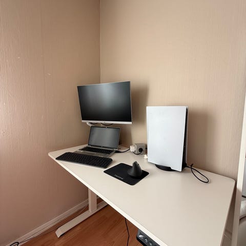 Selger et svært pent brukt elektrisk hev-/senk-skrivebord (150 x 75 cm) i hvit. Kjøpt for noen måneder siden og fremstår som nesten nytt. Perfekt til hjemmekontor og for deg som vil variere mellom å sitte og stå i løpet av arbeidsdagen.
