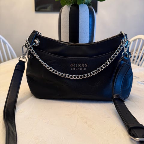 GUESS håndveske i svart kunstlær for dame. Vesken har et strukturert mønster og inkluderer både håndtak og justerbar skulderrem. Innvendig har vesken flere lommer for oppbevaring, og den lukkes med glidelås.