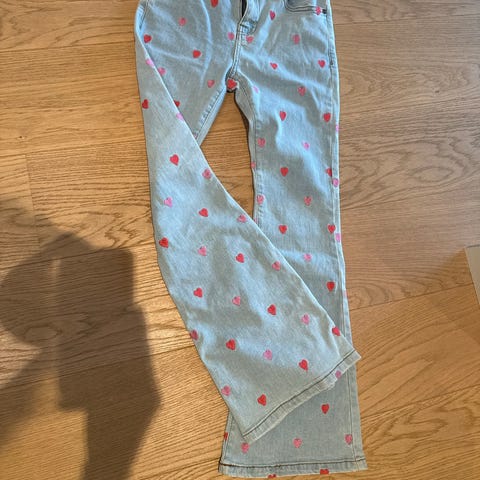 Nydelig lett olabukse med stretch og litt sleng. Lys blå farge. Fine broderier med sommerfugler og blomster. Str 140. Lappen henger på. Ny pris 249 kr.