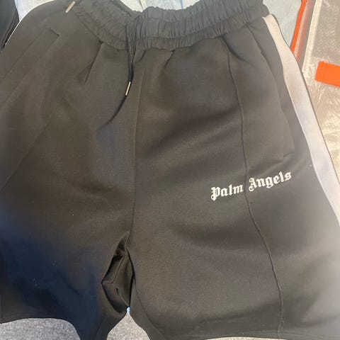 Palm Angels fritid/basketballshorts i størrelse M for herre. Shortsen er svart med hvite detaljer langs sidene og har elastisk midje med snøring.