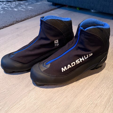 Madshus skisko i svart og rød farge. Skiskoene har en profilert såle for bedre feste og er laget for bruk på ski.