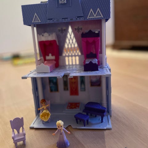 Frost/ Elsa dukkehus med flere rom og litt tilbehør seng, sofa, vask og hylle. En liten heis med lys som kan dras opp og ned i etg. Dukkehuset er designet for lek og oppbevaring av små dukker og tilbehør. Laget i plastmateriale med detaljerte vinduer og dører. Passer for barn som liker rollelek og fantasifull lek.