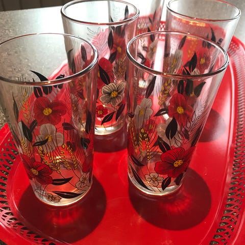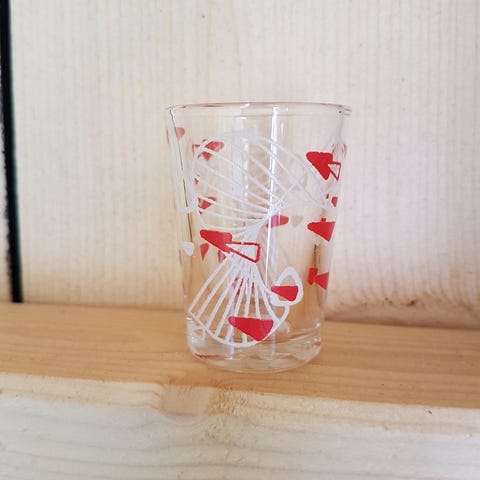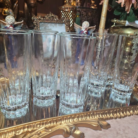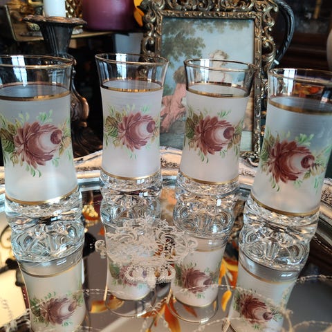 Samling av ulike glass med gullkant, inkludert shotglass og små drikkeglass. Glassene har forskjellige farger og dekorative motiver, blant annet bylandskap og figurer. Noen glass har grønne stilker, mens andre er klare med fargede detaljer. Egnet for samling eller bruk som dekorative drikkeglass.