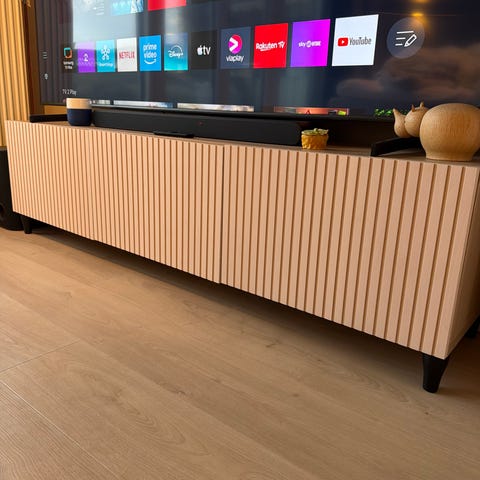 Pent brukt tv-benk 180 cm, med hel glassplate på toppen. Glassplaten beskytter møbelet mot hakk og merker, og gir et løft til designet.