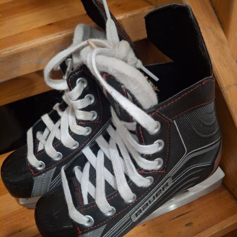 Bauer Vapor ishockeyskøyter for barn i størrelse 32. Skøytene er svarte og designet for ishockey. Materialet og konstruksjonen er tilpasset for bruk innen ishockeysporten.