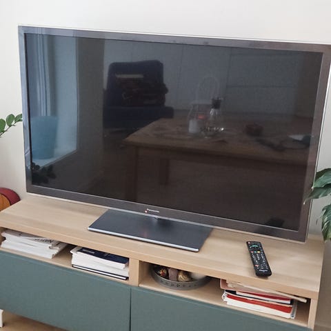Panasonic TV. Flatt TV-apparat med svart skjerm og sølvfarget stativ. Passer til generell bruk som underholdningsenhet i hjemmet.