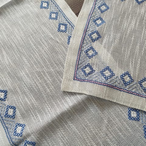 håndbrodert - korssting bordløper / duk med lilla og blå blomstermotiver.