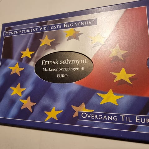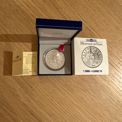 Europa 500 frances sølvmynt med motiv av en rytter og kart over Europa. Mynten er innkapslet i en beskyttende kapsel.