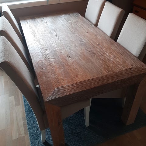 Bordet har noen fått noen merker, men er ellers veldig solid. Det følger med 8 stk stoler og 2 lemmer.