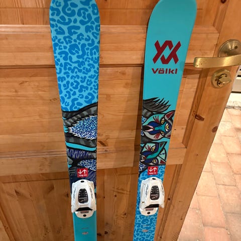 Alpinski med binding brukt av ett barn. Pent brukt, kun en ripe under den ene skien.