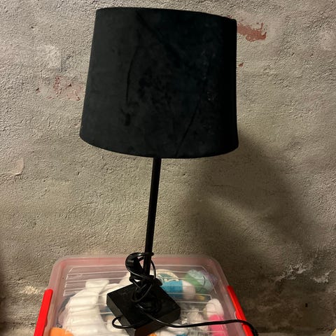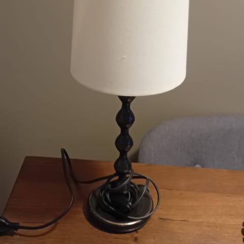 Bordlampe med svart lampeskjerm og metallfot. Lampen har et enkelt og funksjonelt design som passer til ulike rom og innredningsstiler.
