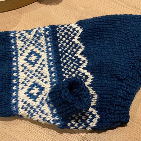 Kan maskinvaskes. Strikket i mariusmønsteret med godkjenning for å bruke mønsteret. 100% ull