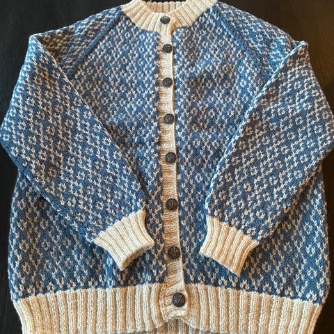 Selger en nydelig strikkejakke. Fargen er dyp blåfarge og hvit.
