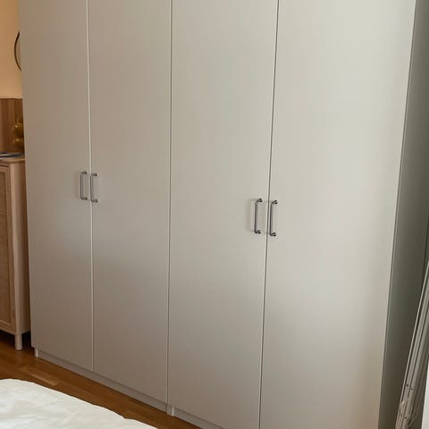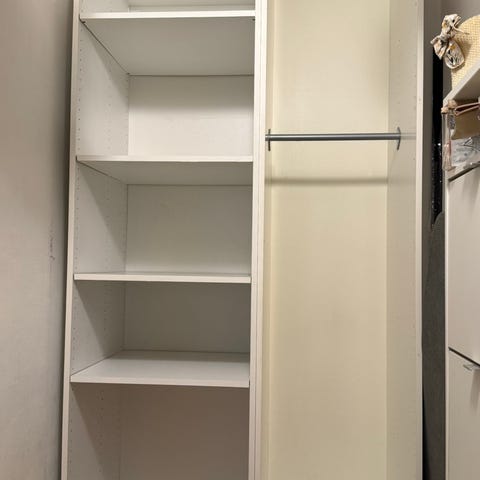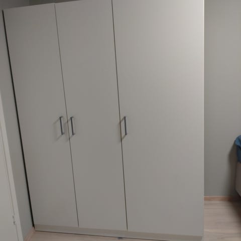 Selger to stk identiske garderobeskap. Et av skapene mangler dører.