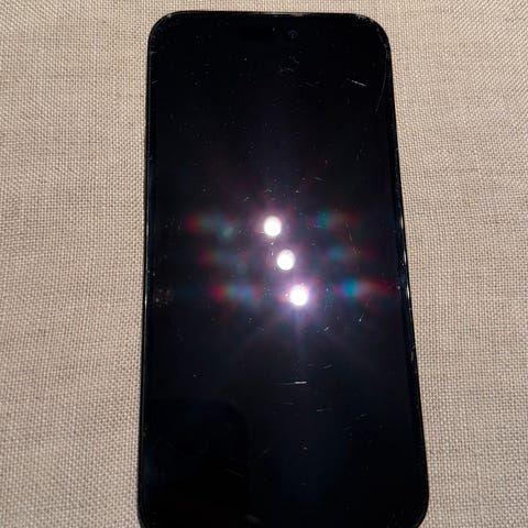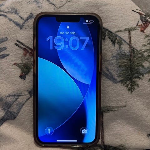 Apple iPhone 14 mobiltelefon med 128 GB lagringskapasitet. Telefonen er i god stand, har kun noen små hakk på øverste kant.