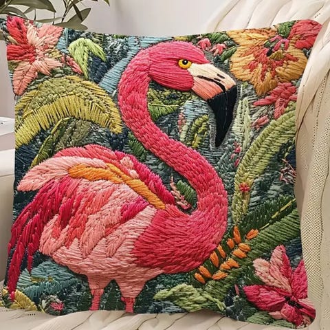 Flott abstrakt kunsttrykk på forsiden, oransje velur på baksiden.
