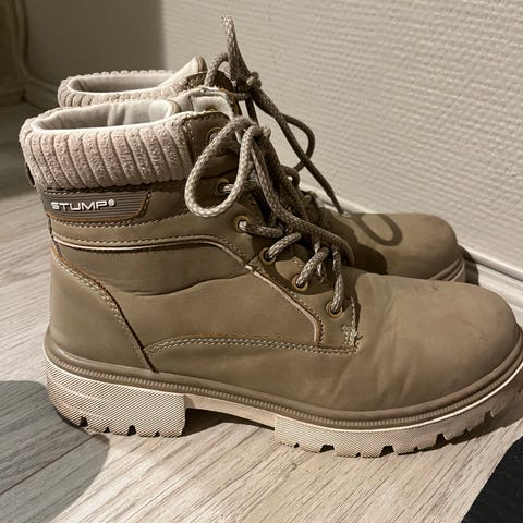Veldig pent brukte vintersko til jente/dame i fin lys beige farge. Pen pelskant og varmt fôr innvendig. Snøring. Vanntett overflate på foten gjør at de er fine i slaps og snø. Kjøpt forrige vinter, brukt kun et par ganger før de ble for små. Må hentes.