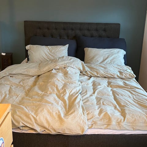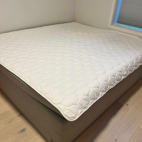 Sengen, fra kvalitetsprodusenten Svane, er noen år gammel, men fjærene i god stand og overflaten er uten synlig slitasje. Den er fortsatt meget god å ligge på! Madrassen kan vendes, og man kan slik velge mellom hard og medium. Overmadrass og sengegavl følger ikke med.