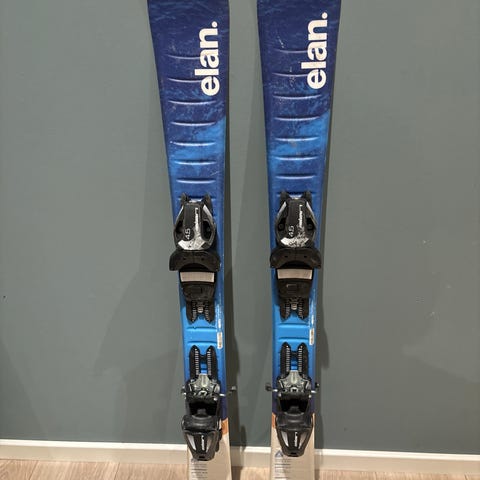 Elan ski med bindinger i blå og hvit farge. Skiene har tradisjonelt design og er egnet for alpin bruk.