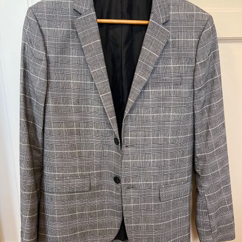 H&M dressjakke og bukse i svart farge, størrelse S for herre. Dressjakken har frontlommer, innerlomme og glatt fôr. Dressbuksen har beltehemper og er laget for formelt bruk. Ullblanding og slimfit