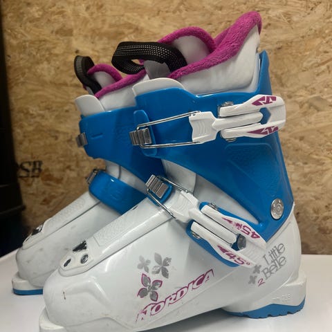Head Thang alpinski støvler i størrelse 200-205 mm. Støvlene er hvite med rosa blomsterdetaljer og har to spenner for justering.