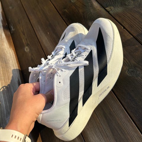 Som nye. Brukt 144 km hvorav 135 er innendørs på tredemølle. Ikke brukt på over et år. Ingen lukt eller skader. Det svarte på sålene er fra gummibåndet på Woodway tredemølle.