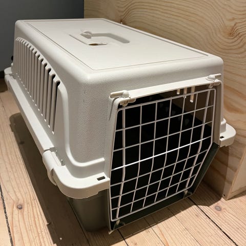 Transportbur for kjæledyr laget i plast med metallgitterdør. Buret har ventilasjonsåpninger på sidene og topphåndtak for enkel bæring. Passer til små til mellomstore kjæledyr.