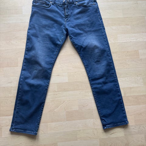 Hugo Boss jeans i bomull, svart farge, størrelse W38 og herrestørrelse XL. Jeansene har klassisk design med lommer foran og bak, og passer til hverdagsbruk.