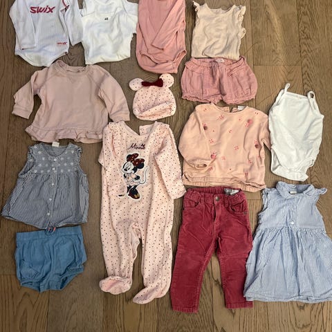 Klespakke med kjoler, jakker og 15 bodyer hvor de fleste er ubrukt.