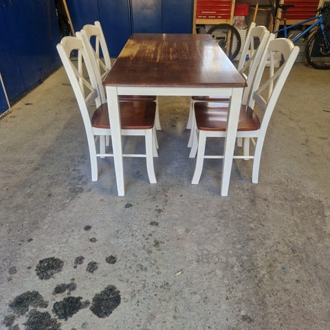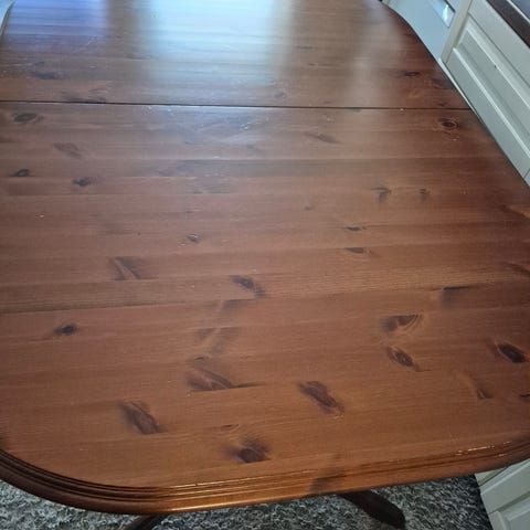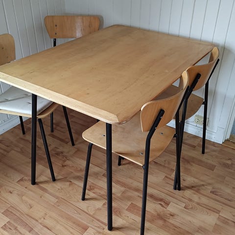 Spisebord med 7 stoler men 1 stol er ødelagt. Det går å bli lengre bord.