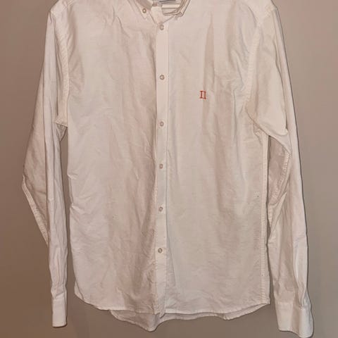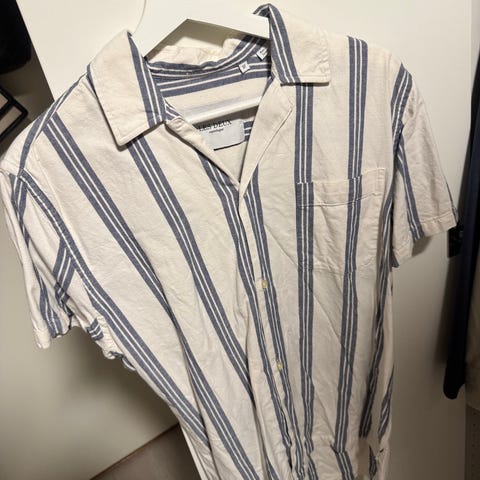 Les Deux skjorte i blå bomull, størrelse L for herre. Skjorten har blått stripete mønster og er laget i bomullsmateriale.