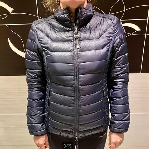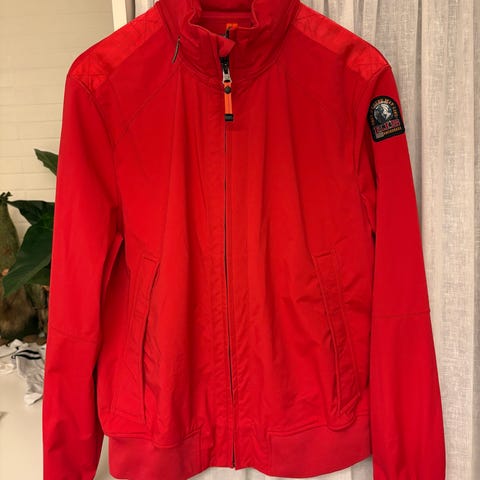 Parajumpers lett jakke for kvinner i størrelse L. Jeg bruker vanligvis str M. Jakken er beige og laget av bomull. Den har flere lommer og en hette.