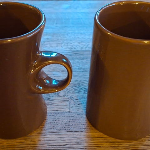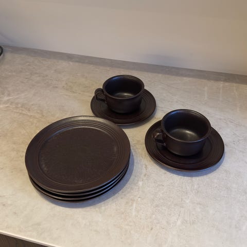 Vintage kopper i svart keramikk. To kopper med rund form og hank. Egnet for servering av varme drikker. Omkrets m/hank :13 cm H,6 cm. Søkeord: kjøkken,vintage,retro,interiør,stue,keramikk,porselen,kunst,håndlaget,unik,stilrent