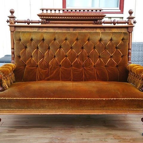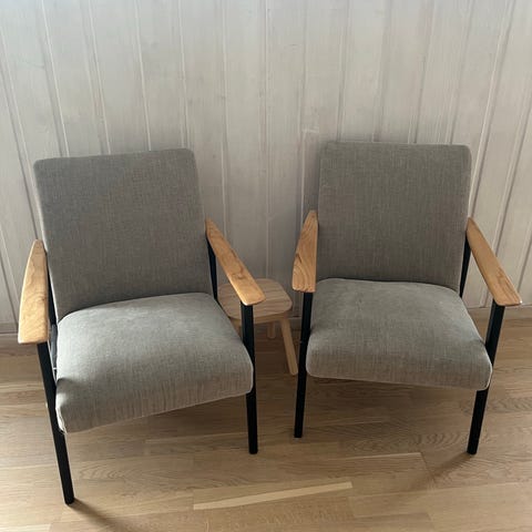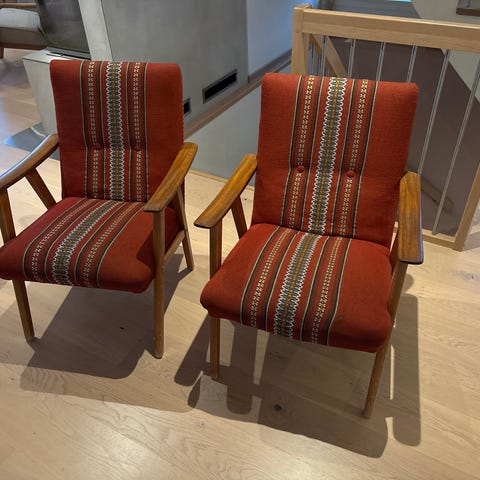 Selger to eldre stoler, veldig god å sitte i. Trevirket trenger en puss, stoffet er i god stand. 1500 per stykk.